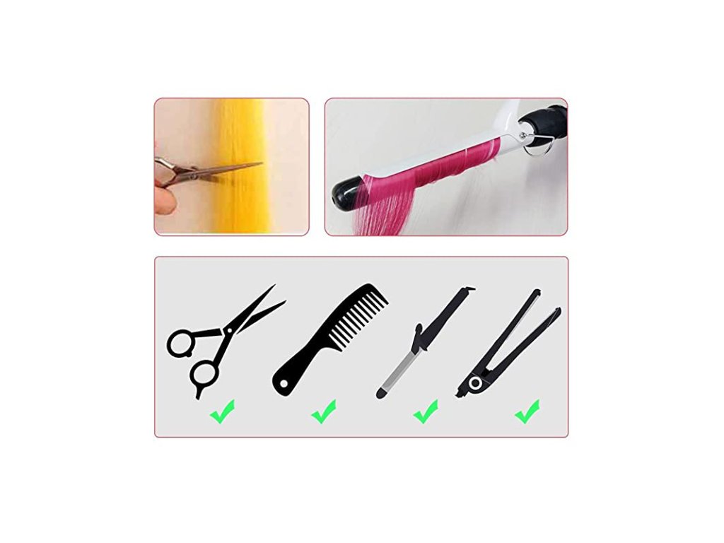 Barevné rovné paruky se dodávají s malými sponkami a snadno se používají. Jedná se o vysoce kvalitní syntetické vlákno. Vypadájí jako opravdové vlasy a můžete si je předělat pomocí nůžek a natáček. Design přichytovacího klipu je tenký a neviditelný - snadné připevnění i odstranění. Barevné prodloužení vlasů je dlouhé cca 55 cm, což v podstatě vyhovuje délce vlasů každého. Příliš dlouhé vlasy lze zastřihnout, dokud nebudou vyhovovat vašim potřebám. Chcete-li získat kudrnatý tvar, můžete použít žehličku na vlasy, nebo kulmu, ale teplota by neměla přesáhnout 160℃.