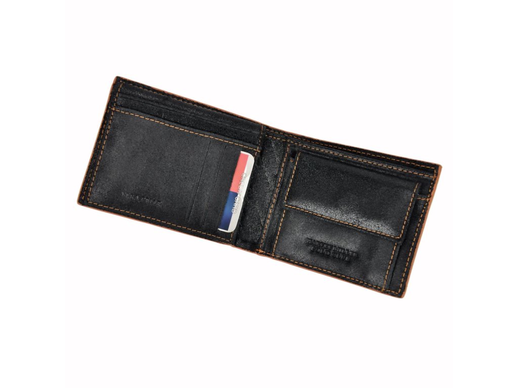 Po otevření se peněženka dělí na dvě praktické části – v první se nachází mincovník uzavíratelný na druk, ideální pro drobné mince, a ve druhé najdete přihrádky na kreditní a věrnostní karty i prostor pro doklady. Fochy na bankovky jsou umístěny v horní části peněženky a umožňují pohodlné uspořádání hotovosti. Precizní obšití po obvodu zajišťuje dlouhou životnost i elegantní vzhled. Peněženka je dodávána v stylové papírové krabičce, takže je ideálním dárkem pro muže, kteří oceňují kvalitu a klasický design.