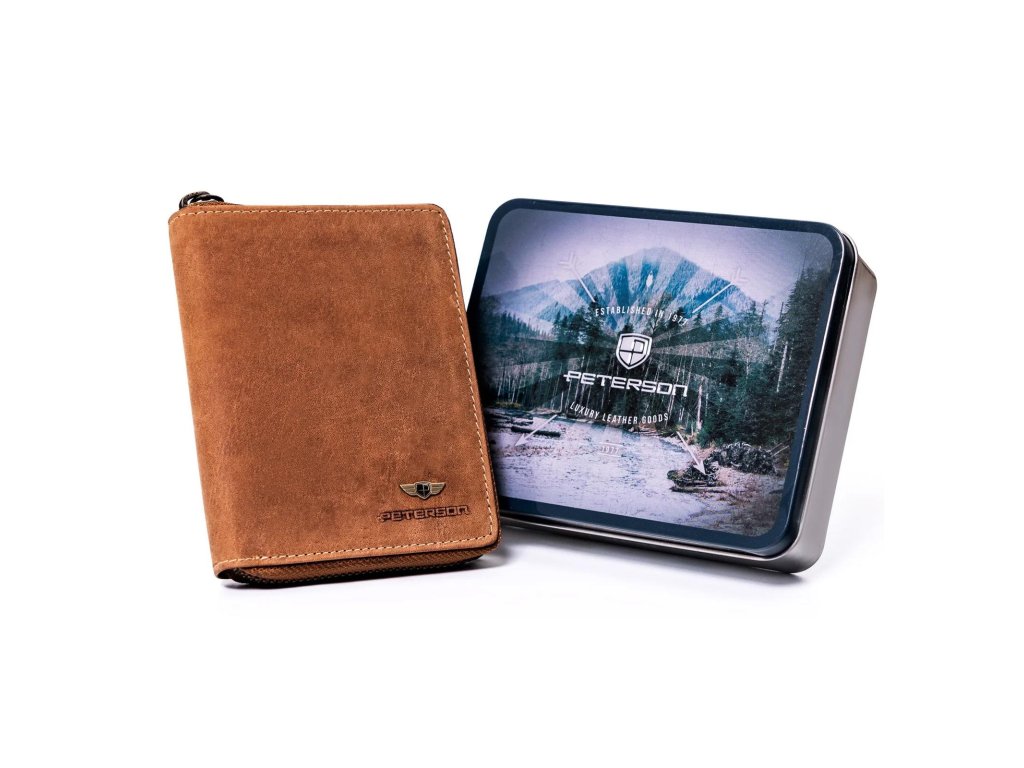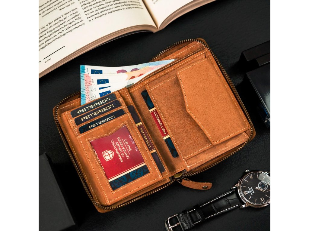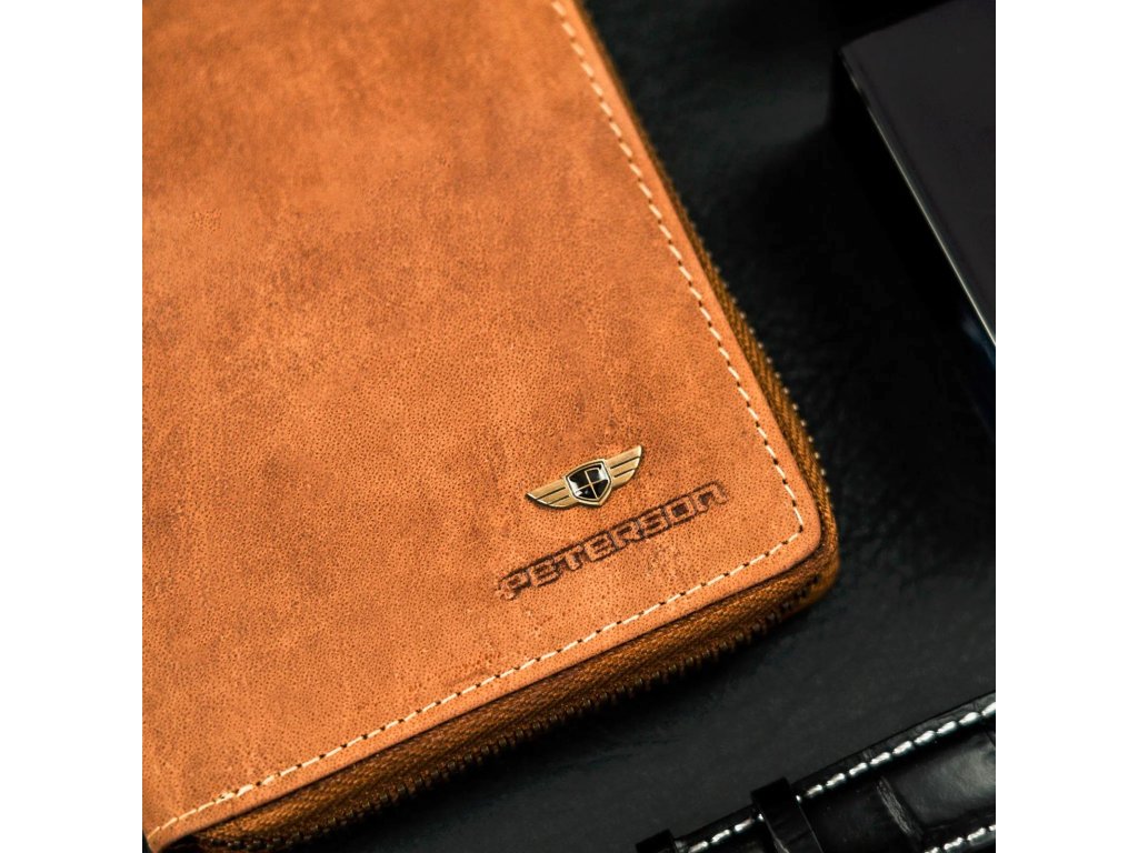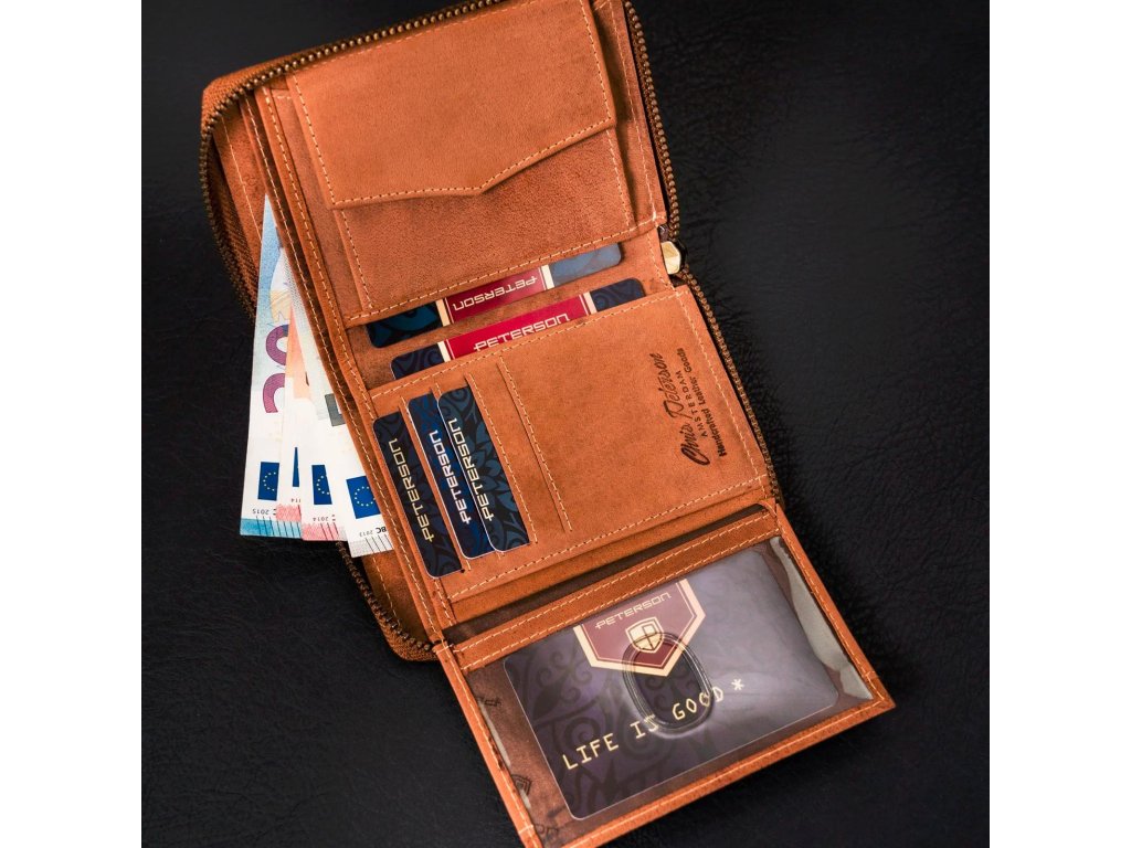 Elegantní a praktická pánská peněženka Peterson z vysoce kvalitní přírodní kůže. Klasický design v odstínech hnědé doplňuje bezpečné zapínání na zip, které chrání vaše cennosti před vypadnutím.