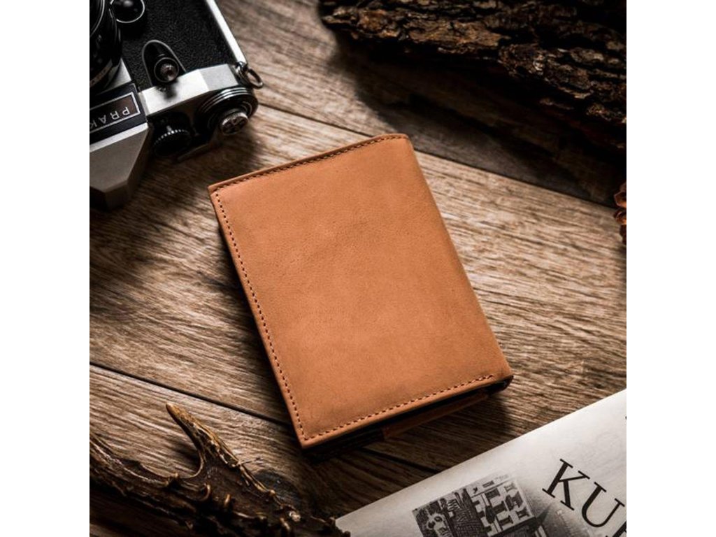 Peněženka je vyrobena z prvotřídní přírodní kůže, která zaručuje vysokou odolnost i elegantní vzhled. Její svislá orientace bez vnějšího zapínání působí moderně a minimalisticky, zatímco camelová dekorativní vložka dodává stylový kontrast.
